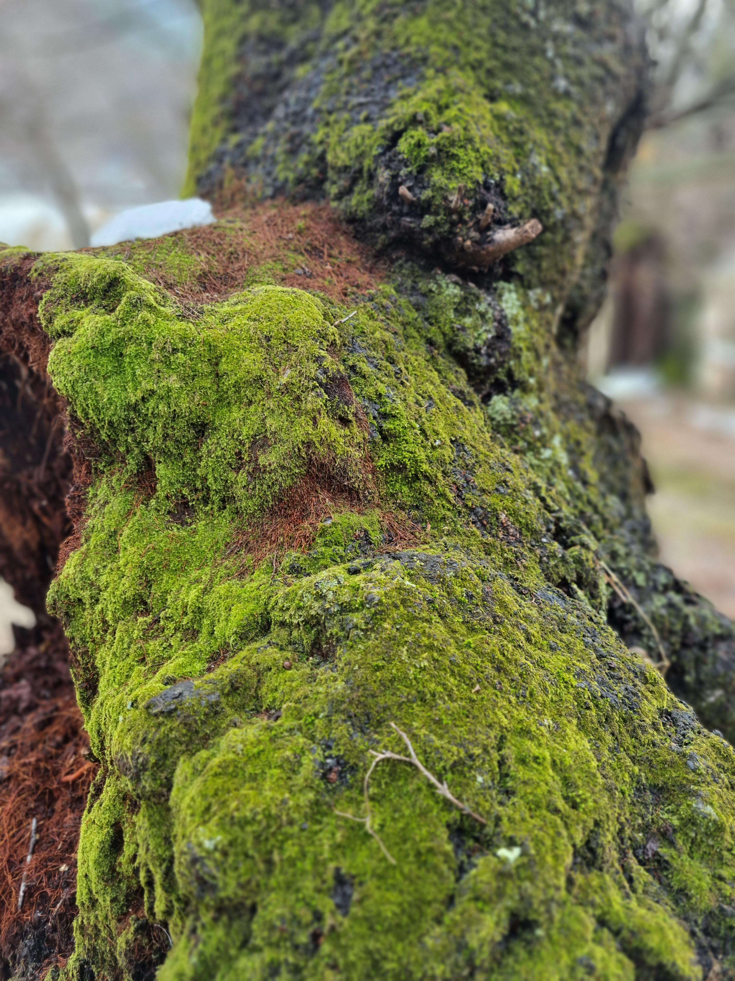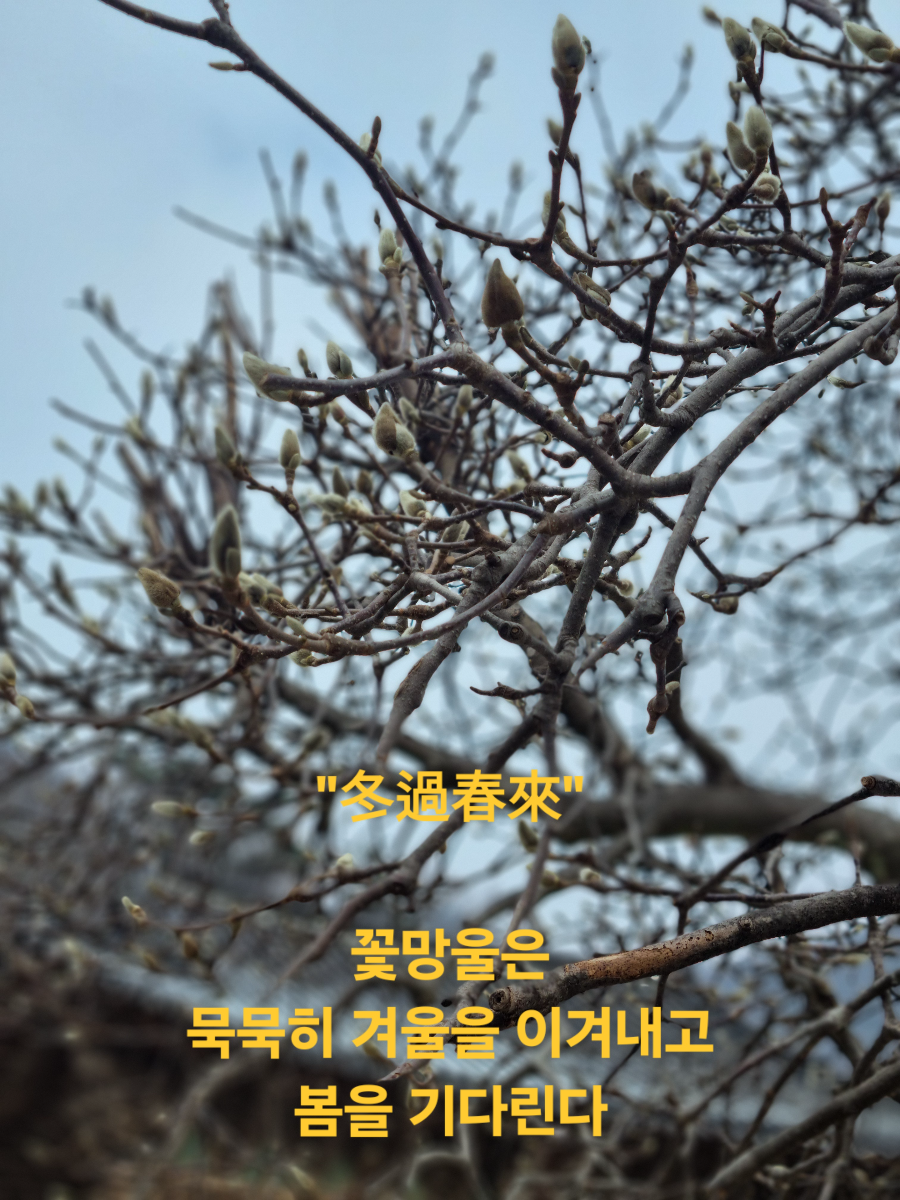 조용한 자연 속에서 묵묵히 서 있는 고목과 동백꽃나무의 겨울 눈망울은 지난 세월 동안 겨울을 이겨내고 봄 꽃을 선사합니다.