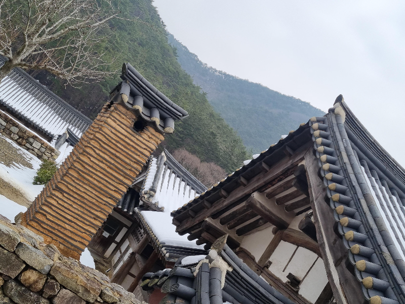 며칠 전 내린 눈 들이 곳곳에 쌓여 있고 산사의 지붕에 쌓인 하얀 눈들이 처마 아래로 톡톡 툭툭 탁탁 녹아내립니다.