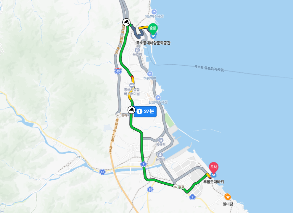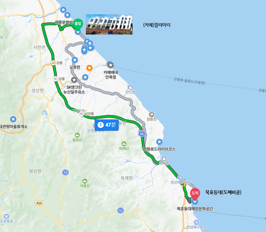 강릉 -> 동해 ( 약 58 Km : 50분 거리) 도째비골로 출발 합니다.