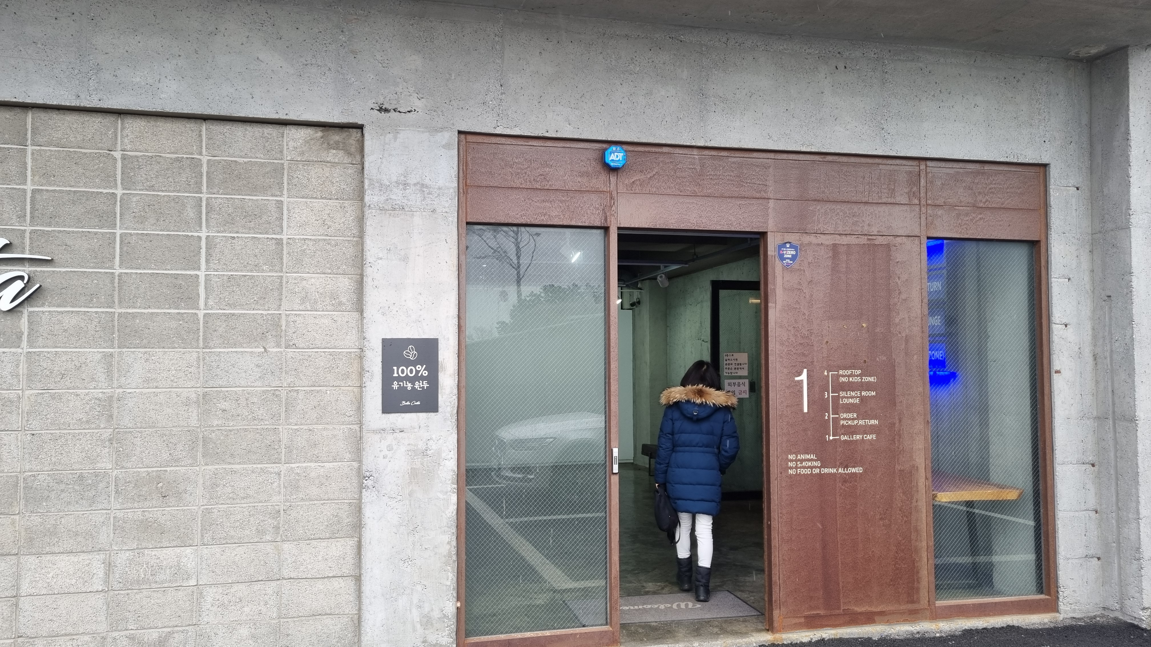 신관 주차장에서 1층 출입문이 보입니다. 엘리베이터를 타고 2층에 올라 가면 됩니다.