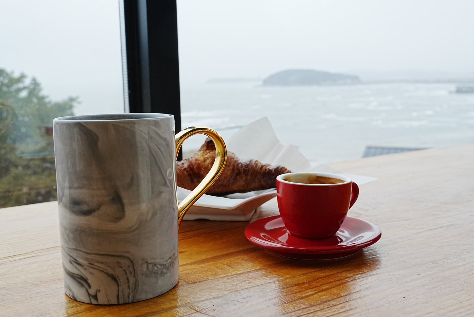 바다 멀리 죽도 상화원이 보이는 창가에 앉아서 눈이 내리고 바람이 부는 겨울 바다를 구경합니다. 겨울 바다의 끝없이 밀려오는 파도 들을 바라 보면 시간 가는줄 모르게 "물멍"하기 좋은 장소 입니다.