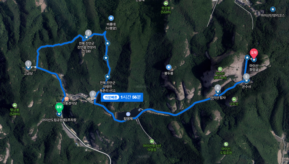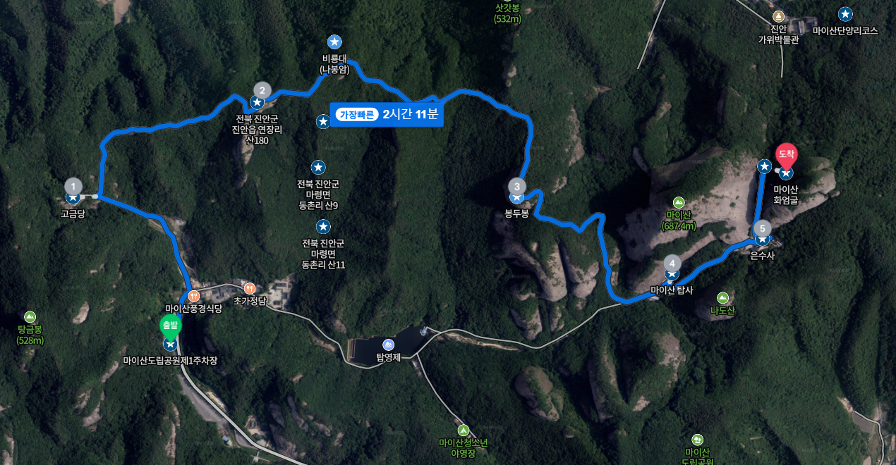 마이산도립공원제1주차장 → 고금당 → 전북 진안군 진안읍 연장리 산180 → 봉두봉 → 마이산 탑사 → 은수사 → 마이산 화엄굴