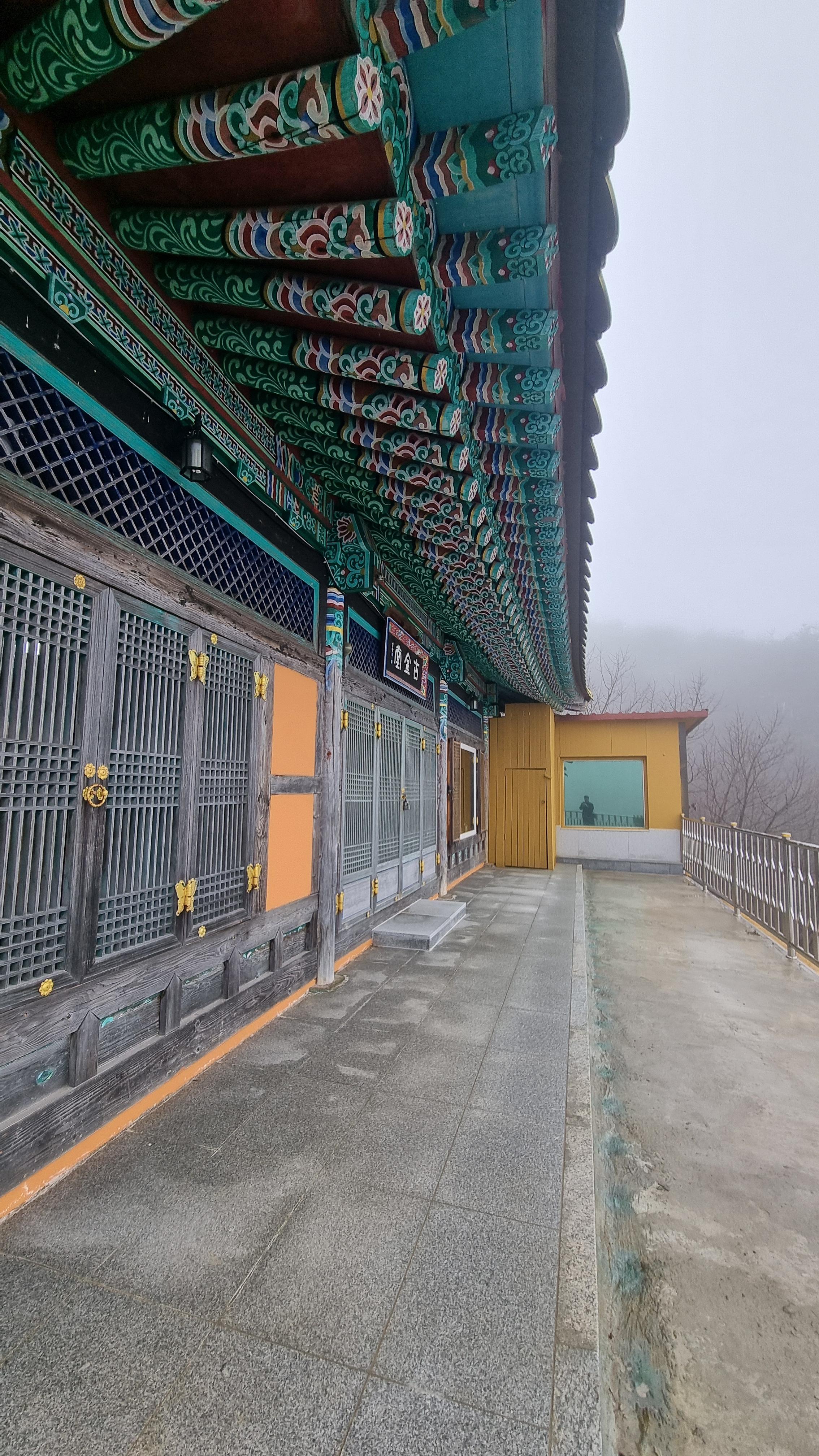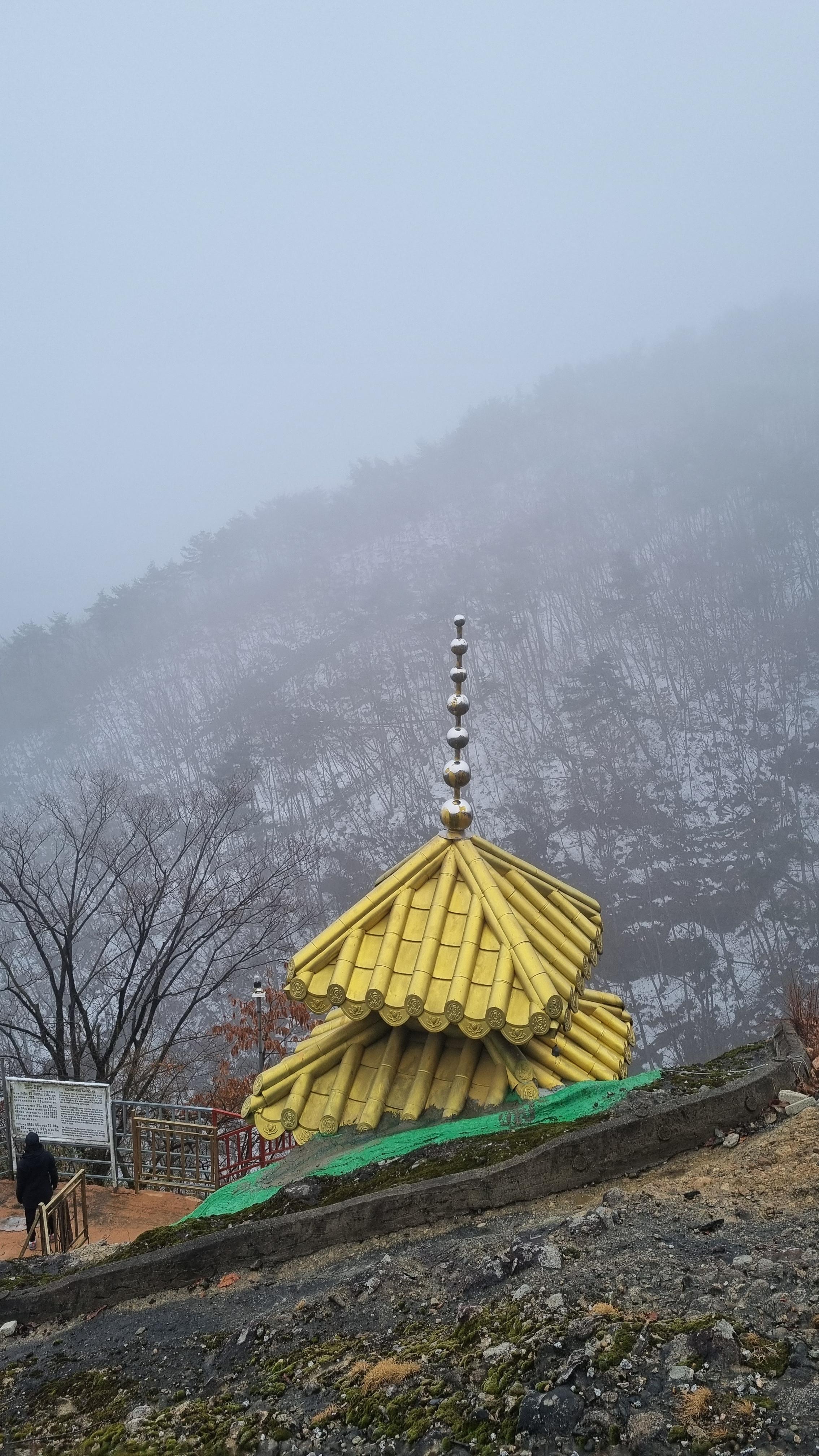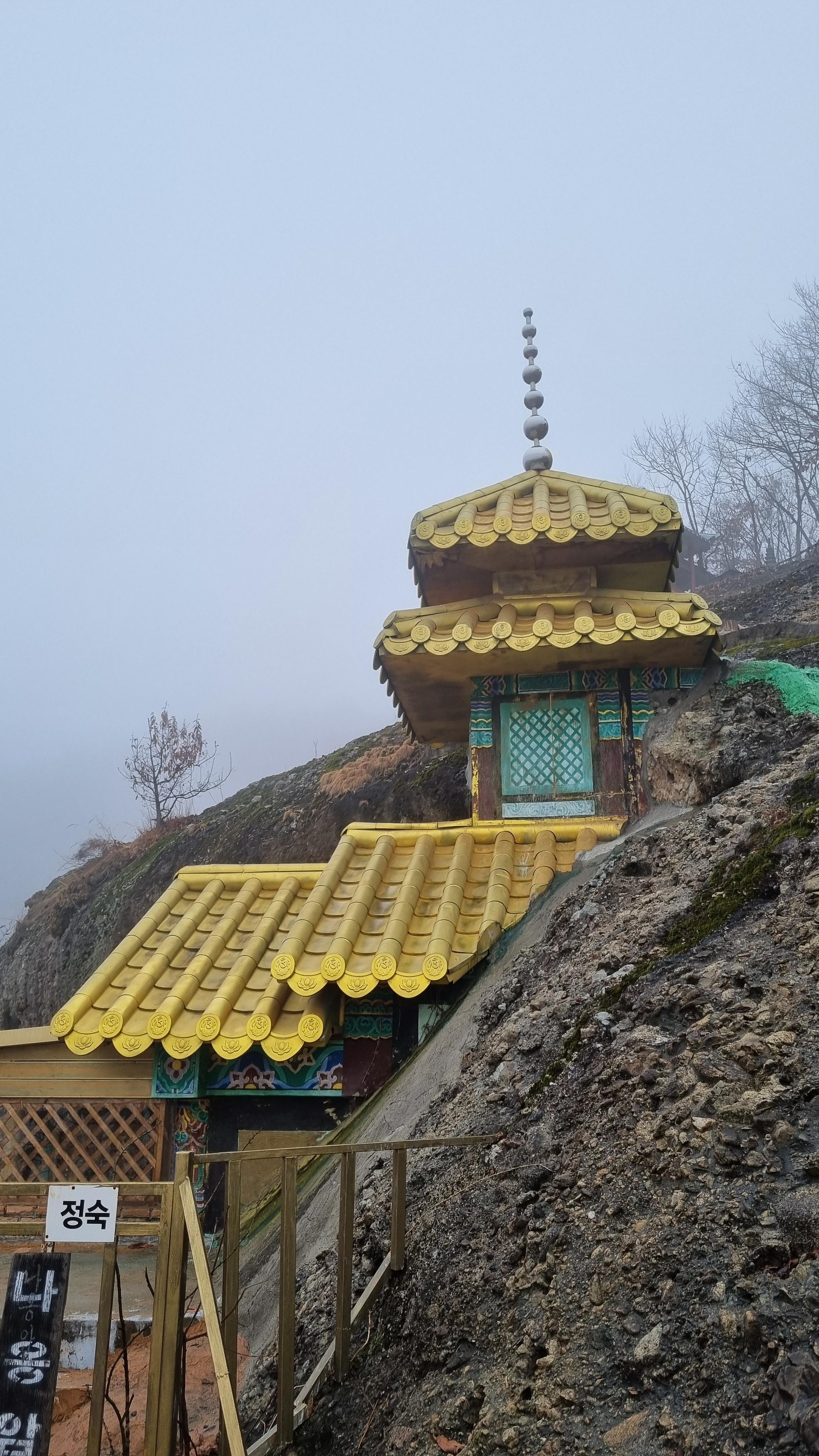 고금당 금빛 탑사와 가파른 바위에 암자를 만들어 안개가 없으면 멋진 풍광이 보일 것 같습니다. 멀리 금당사와 탑영재 호수가 보이는 곳에 위치해서 마음이 탁트일 듯합니다. (오늘은 안개가 짙어서 한 치 앞도 잘 안 보입니다.)