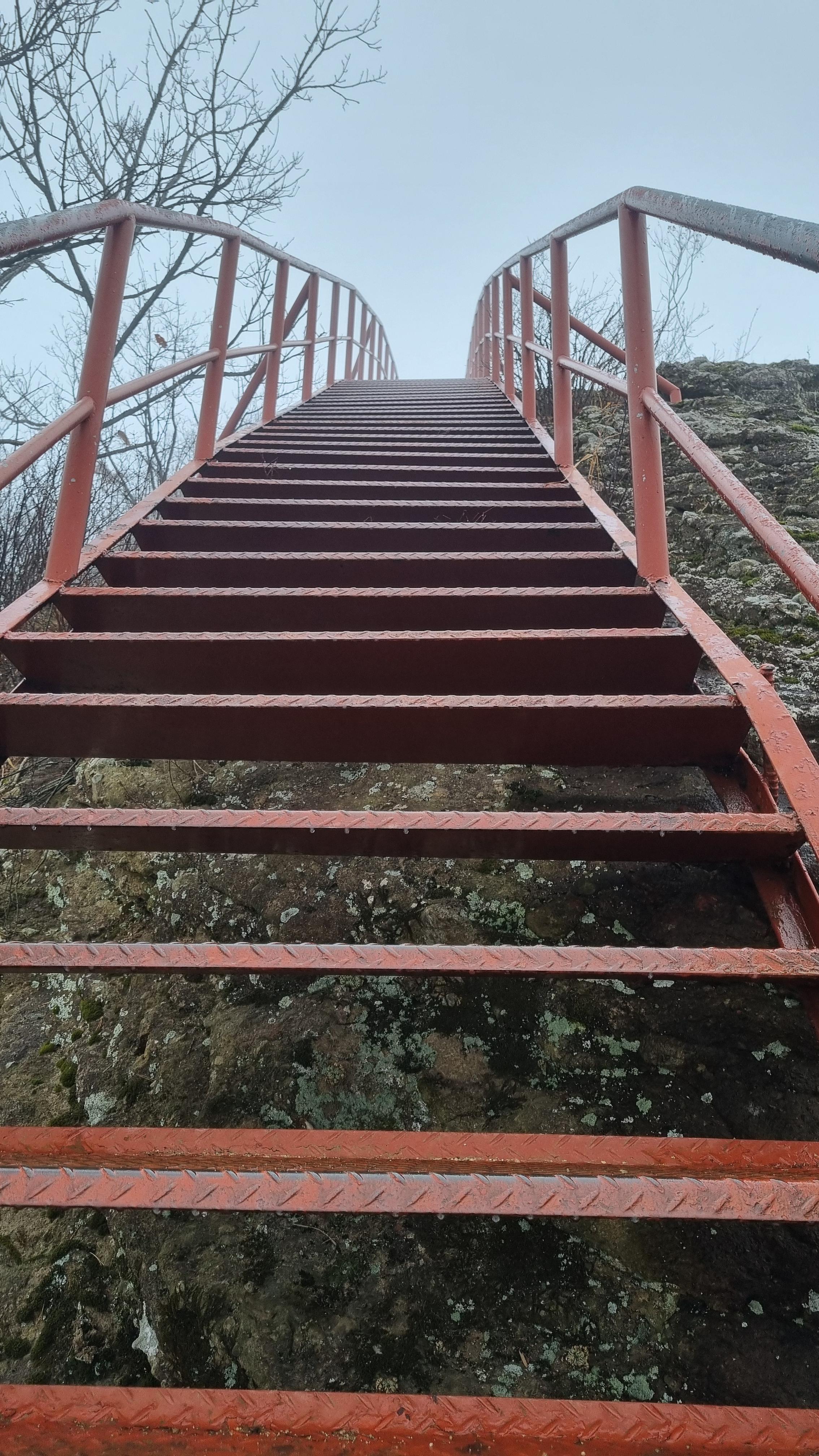 드디어 비룡대 전망대로 올라가는 철계단이 나왔습니다. 이날은 주위에 안개로 아무것도 안 보이고 여기쯤에서 마이산도 보인다는데 보지를 못했습니다. 철계단 손잡이는 이슬로 축축하고 손이 싫어 울 정도로 물도 많아서 아찔하게 한 발씩 올라갔습니다. 정말 후들후들한데 계단의 높이가 거의 사다리 올라가는 수준이라 꾹 참고 올라가야 합니다.