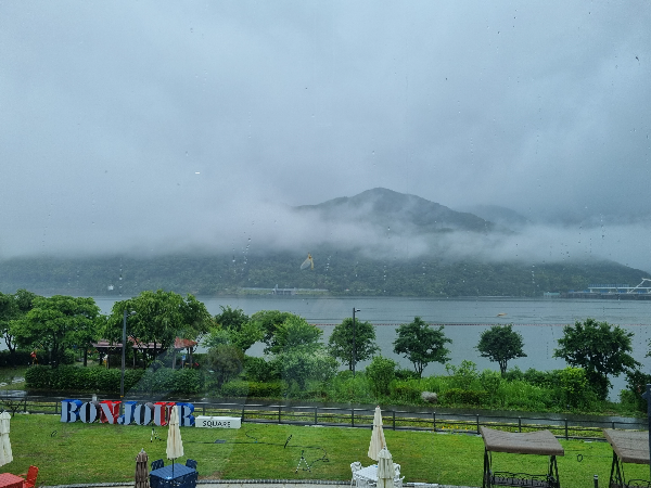 비가 와서 건물 전체를 보지는 못했지만 2층에서 구름이 지나가는 검단산과 한강을 보면서 물멍 하면 시간은 금방 지나갑니다.